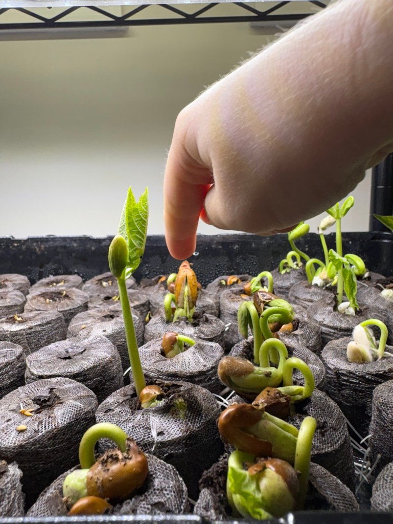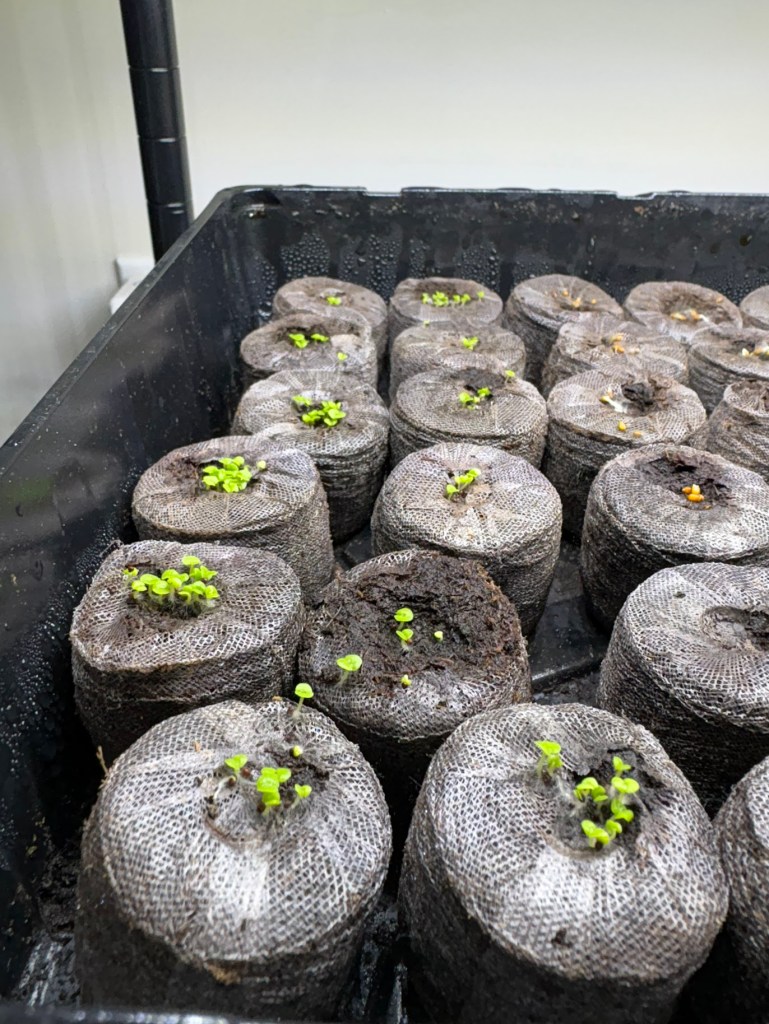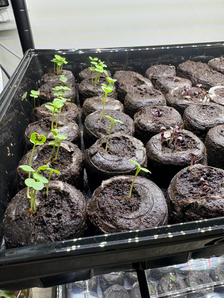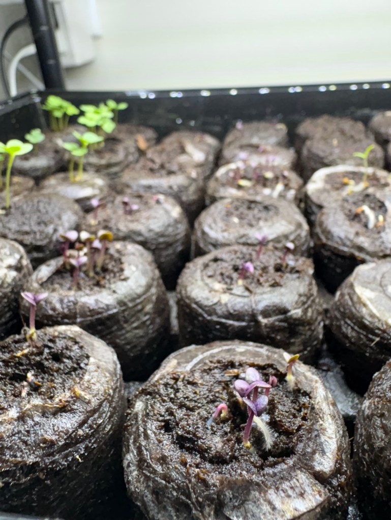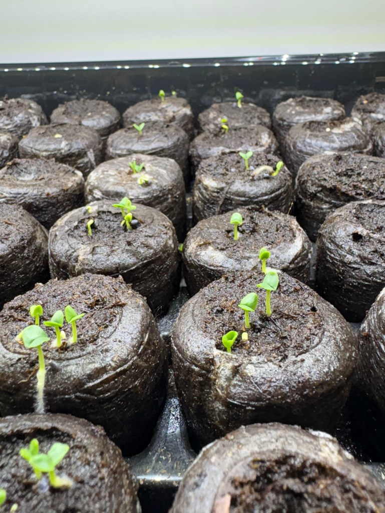 I see that the sprouts were down, but now they’re straight. I can see white roots coming out of the circles made of peat.
