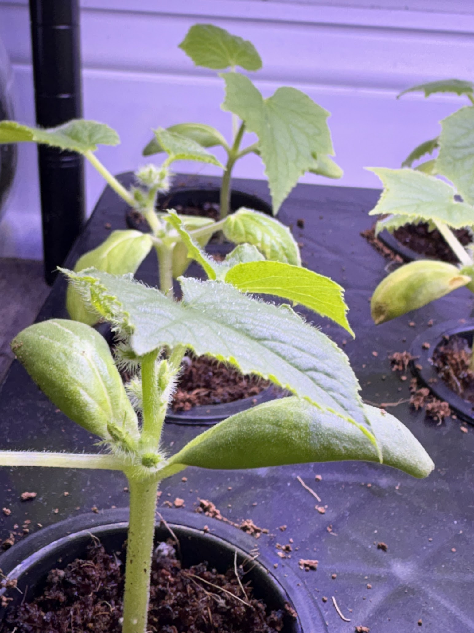 OK, the ones in the middle are the cucumbers. Those cucumbers are doing well, what cucumbers do! They’re growing, the leaf is more than 3 centimeters! It’s one inch long!